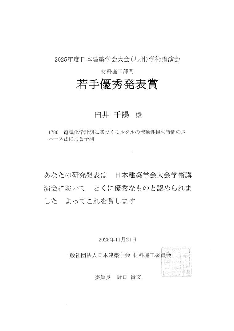 臼井千陽さんが日本建築学会大会 若手優秀発表賞(材料施工部門)を受賞しました。